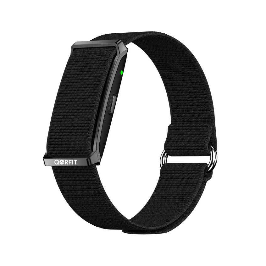 Two bands are included with the Qorfit Pulse: one black nylon and one black silicone. Colour bands are sold separately in packs of 5, available in two types — EVERYDAY CORE and VIBE CORE.